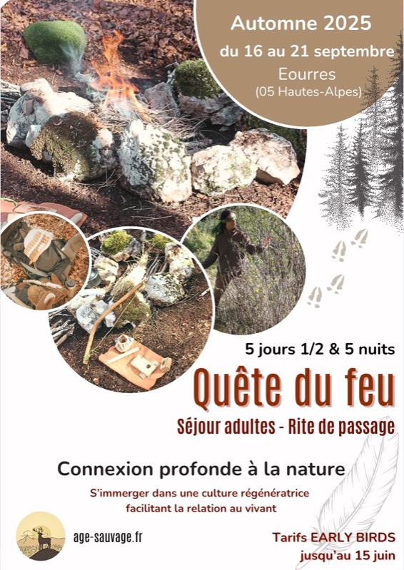 Infos : https://www.age-sauvage.fr/stages-sauvages/sejour-quete-du-feu-adultes