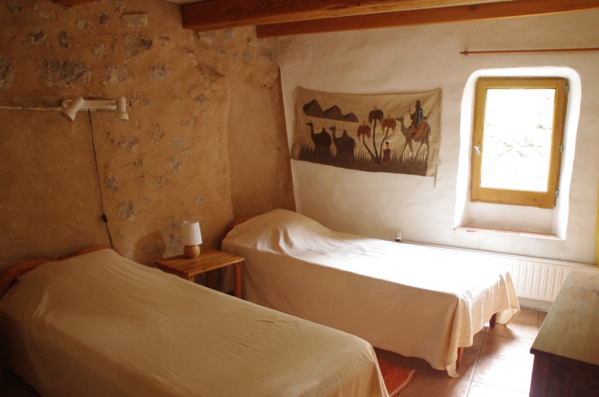 Tilleul : Chambre pour 2 personnes (2 lits simples) avec une salle de bain (douche, lavabo, wc) à l’extérieur de la chambre, partagée avec la chambre en mezzanine.