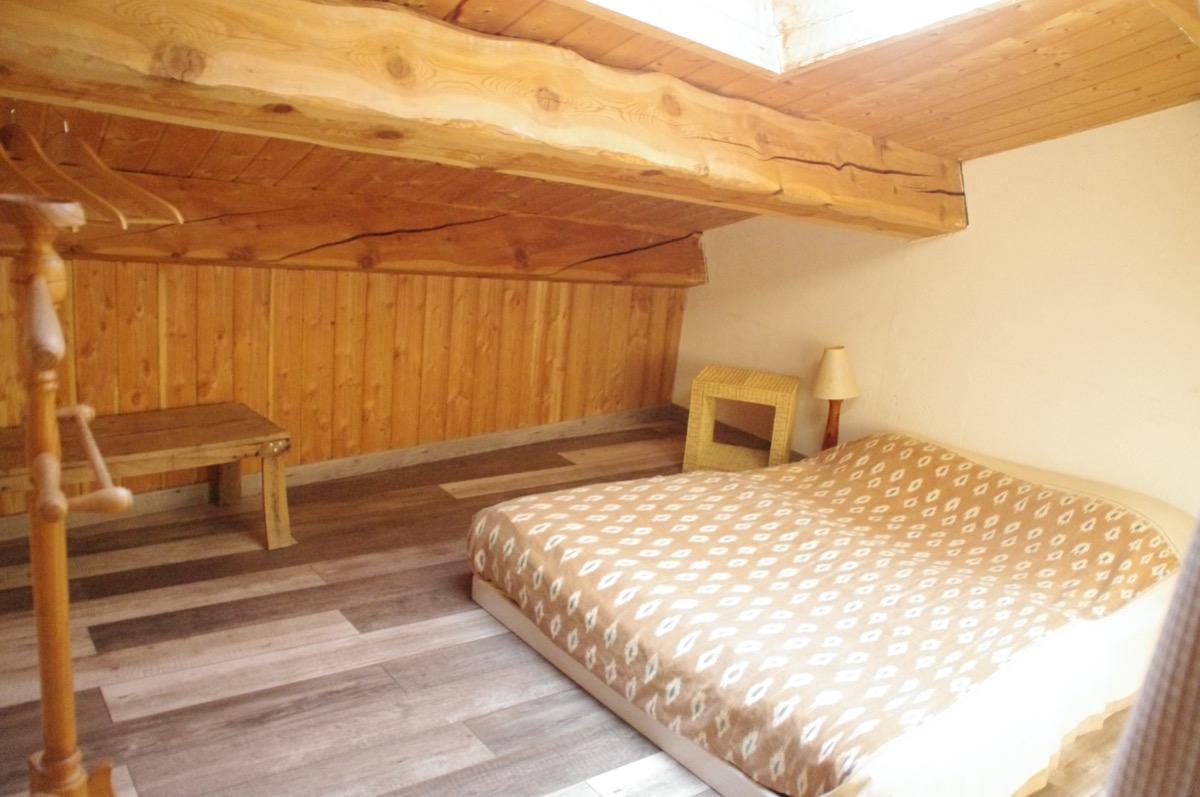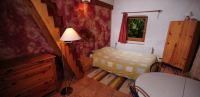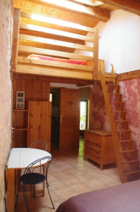 Tilleul Mezzanine : Chambre mansardée avec un lit double, type futon, avec une salle de bain (douche, lavabo, wc) à l’extérieur de la chambre, partagée avec Tilleul (au rez-de-chaussée)