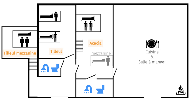 Acacia : Chambre avec une salle de bain privée (douche, lavabo, toilette) et une mezzanine. Elle peut recevoir 3 personnes (1lit double + 1 lit simple en mezzanine).