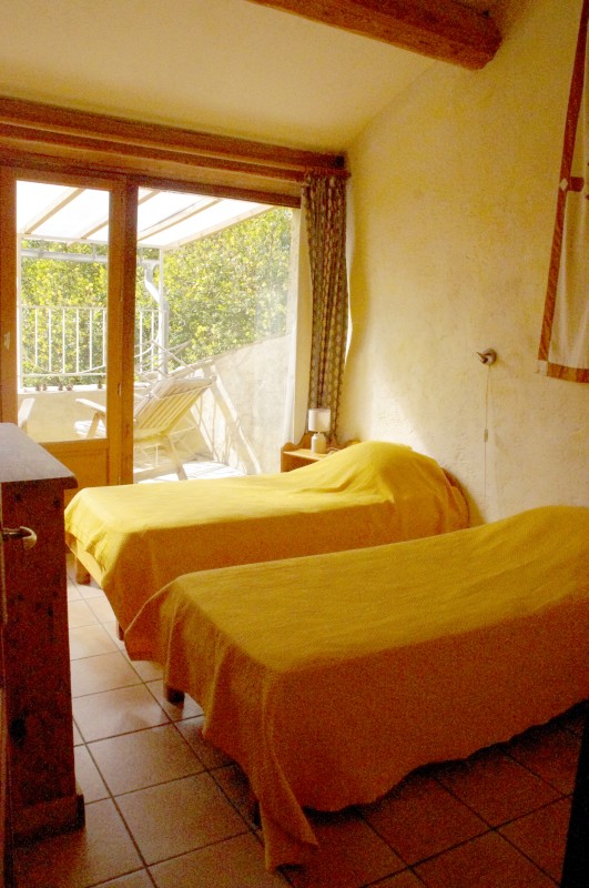 Pin sylvestre : chambre avec 2 lits simples et un accès à la terrasse côté sud, qui offre une vue sur les jardins et la montagne de Mare
